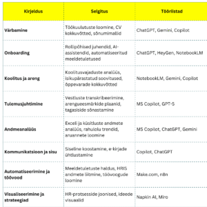 AI personalitöös – kust alustada? Tehisintellekti tööriistu saab kasutada igas personalitöö funktsioonis, sõltuvalt inimese enda vajadusest automatiseerida korduvaid ülesandeid ja kujutlusvõimest. Allpool on toodud mõned lihtsad näited, milliseid tööriistu ja kus neid kasutada, et personalitöö muutuks nutikamaks ja efektiivsemaks.