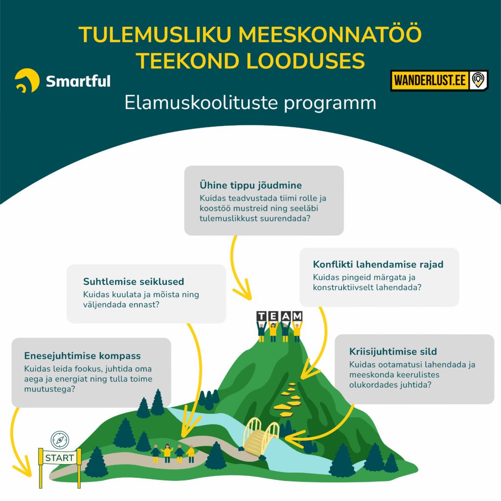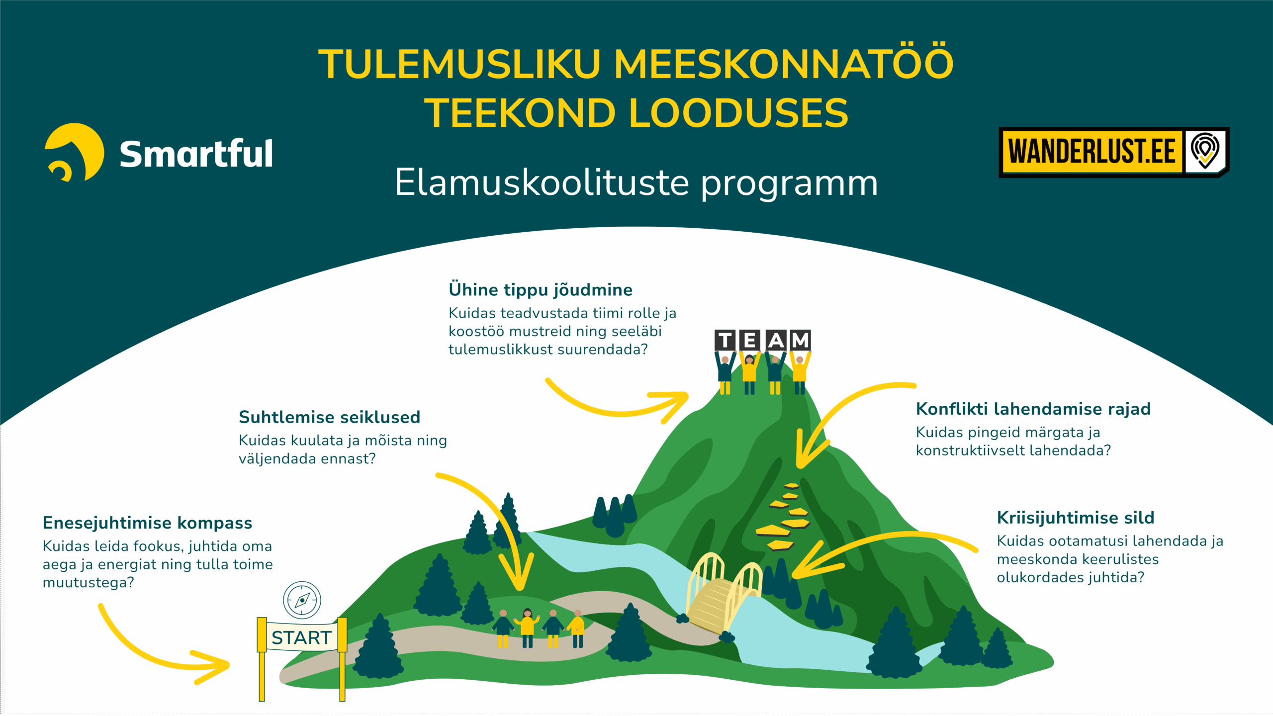 Arenguprogrammi paneme kokku täpselt Sinu soovidest, vajadustest ja võimalustest lähtuvalt. Kaasame oma ala kogenud spetsialiste just neil teemadel, mis Sinu ettevõttele olulised. “Tulemusliku meeskonnatöö teekond looduses” elamusterohket arenguprogrammi viivad läbi nii Smartfuli kogenud koolitajad ja coachid kui ka Wanderlusti kogenud ja väljaõppega matkajuhid.